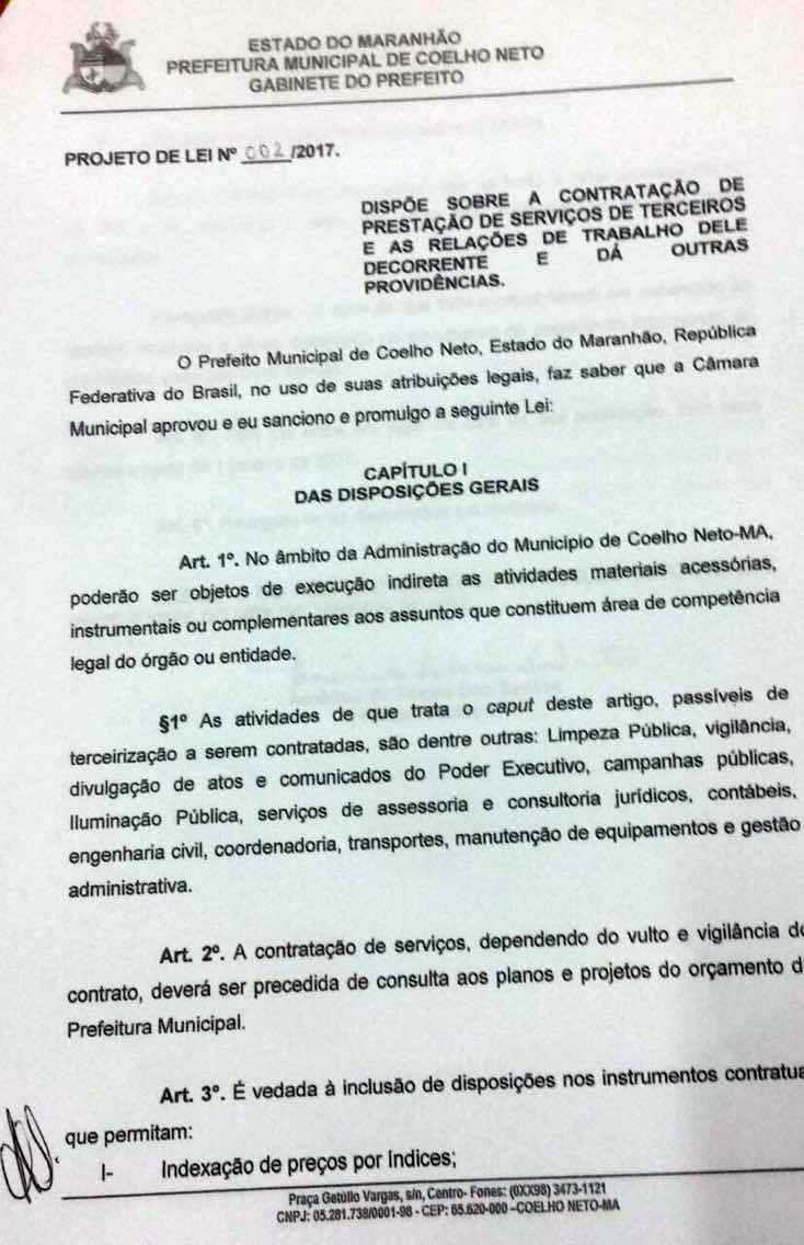CONTRA ou a FAVOR, será a primeira resposta ao executivo sobre Projeto de Lei nº 002/2017, enviado pelo Prefeito Américo de Sousa (PT), que dispõe sobre a contratação de prestação de serviços de terceiros e as relações de trabalho dele decorrentes e dá outras providências, ou seja, TERCEIRIZAR SERVIÇOS.