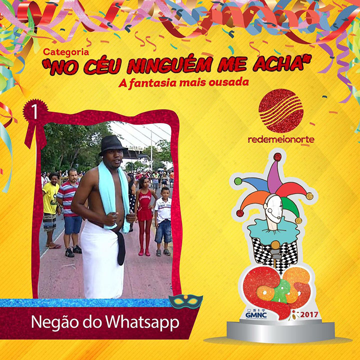 Por fim, a categoria “No céu ninguém me acha” (A fantasia mais ousada), conquistou o título o morador de Coelho Neto, no Maranhão, com 761 curtidas usando a fantasia de “Negão do Whatsapp”.
