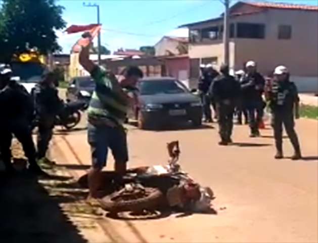 Ao ser abordado em uma blitz da Companhia de Polícia Militar Independente (CPRV), ele apresentou a documentação do ano de 2012, ou seja, estava há 5 anos sem pagar o IPVA. Não deu outra, a CPRV cumprindo ordens, avisou ao cidadão que iria apreender a moto. Em um ato de revolta e descontrole, o homem começou a destruir a própria moto, deixando todos que estavam presente sem reação.