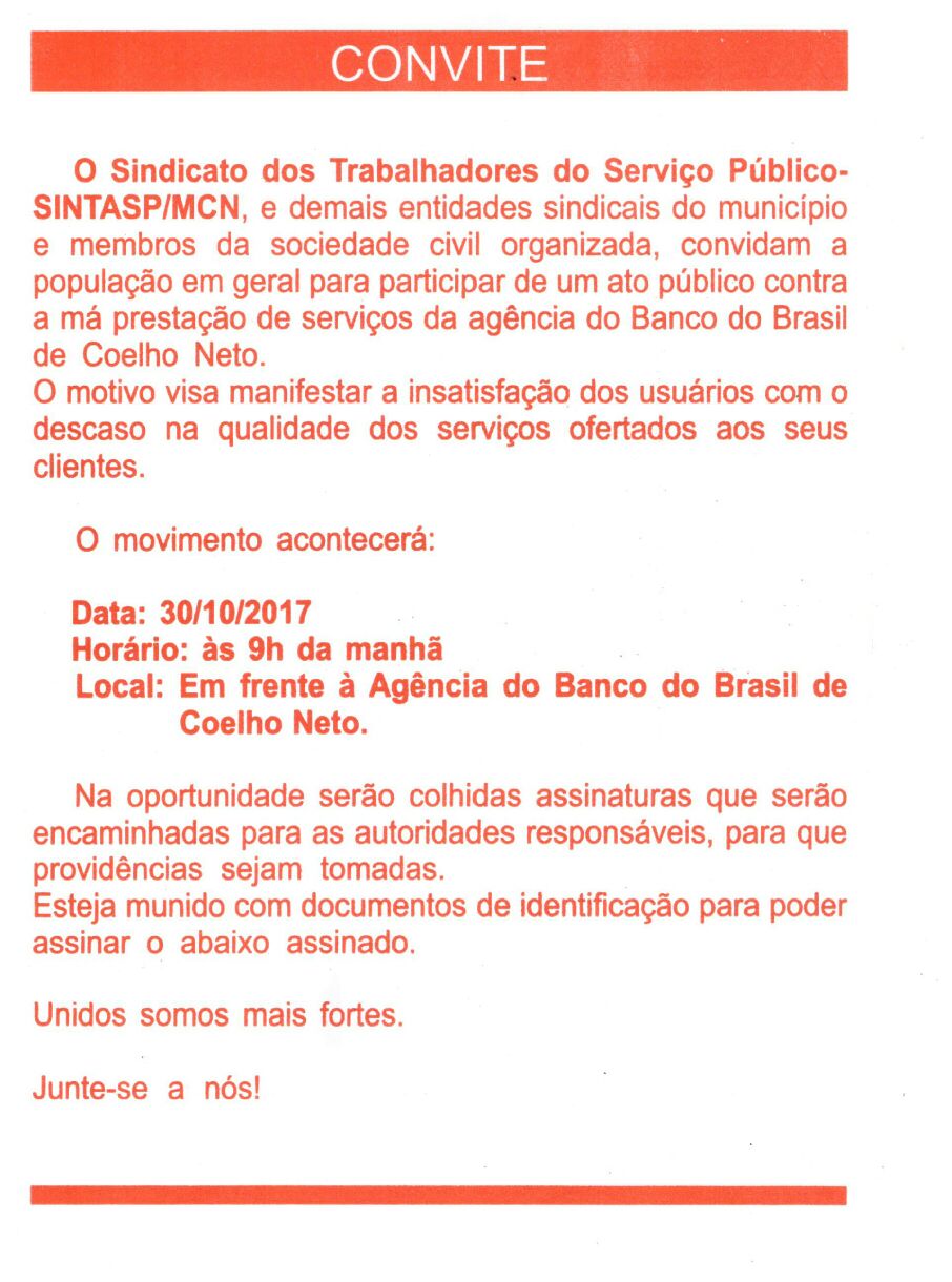 Nesta segunda-feira (30), o SINTASP convocou a população em geral para participar de um ato público contra a Agência do Banco do Brasil de Coelho Neto, motivando a população se manifestar sobre a insatisfação dos usuários com o descaso na qualidade dos serviços ofertados aos clientes do Banco do Brasil de Coelho Neto.
